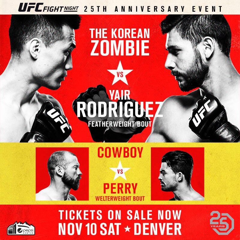 Almost exactly to the date (November 12, 1993), the UFC held their first ever event in Denver, Colorado. An event that saw Royce Gracie win three fights in one night, showing the world that no matter what weight the opponent was, Jui-Jitsu was a mixed martial art form to be reckon with. Twenty five years later, the UFC returns to where it all started in Denver, Colorado with a fun card. Headlining the event is a pair of exciting Featherweights in Chan Sung Jung aka the “Korean Zombie” and Yair Rodriguez.