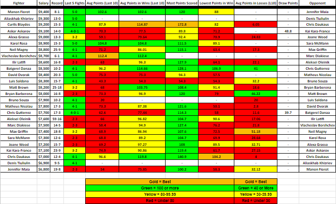 Max Griffin ($7,400) – This one snuck up on me, but Griffin is an intriguing option. Not one to score a whole lot in victories, averaging 86.94 points, Griffin has actually averaged 51.18 in defeat. A number that not only leads the field, but is attributed to perhaps being ousted in multiple decisions that could of gone his way. With that in mind, Griffin may be one of the safest options to side with.
